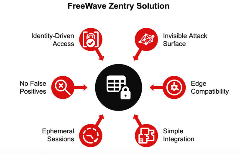 The FreeWave Zentry solution secures not just one component but the entire deployment by making the attack surface invisible – there are no public IP addresses, open ports, or static tunnels to scan or exploit. Ephemeral sessions mean access appears only when needed and disappears when complete, leaving no standing exposure. Deterministic control removes noise, helping small security teams focus on real threats without wasting time on no false positives.